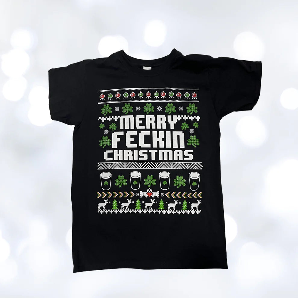 Product Description: Celebrate the holiday season with a hearty dose of Irish humour with our "Merry F*eckin Christmas" T-shirt. Made from high-quality Fruit of the Loom material, this black shirt is both comfortable and durable, ensuring it will last through many festive seasons. The playful design combines classic Christmas symbols with iconic Irish elements, creating a shirt that's as fun as it is unique. Perfect for holiday parties, gatherings, or as a gift for the cheeky individual in your life, this T-shirt is available in a variety of sizes to ensure a great fit for all. Spread holiday cheer and Irish pride with this one-of-a-kind Christmas T-shirt.