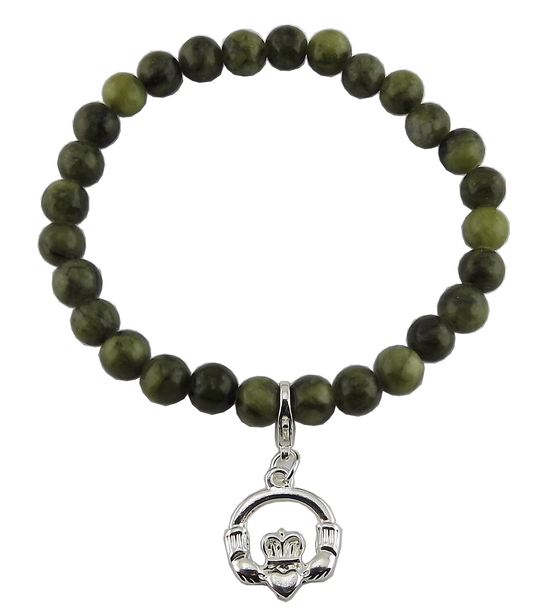 Experience the beauty of Connemara Marble with our exquisite Charm Bracelet. This unique bracelet showcases green beads that beautifully complement the striking silver plated Claddagh symbol charm.