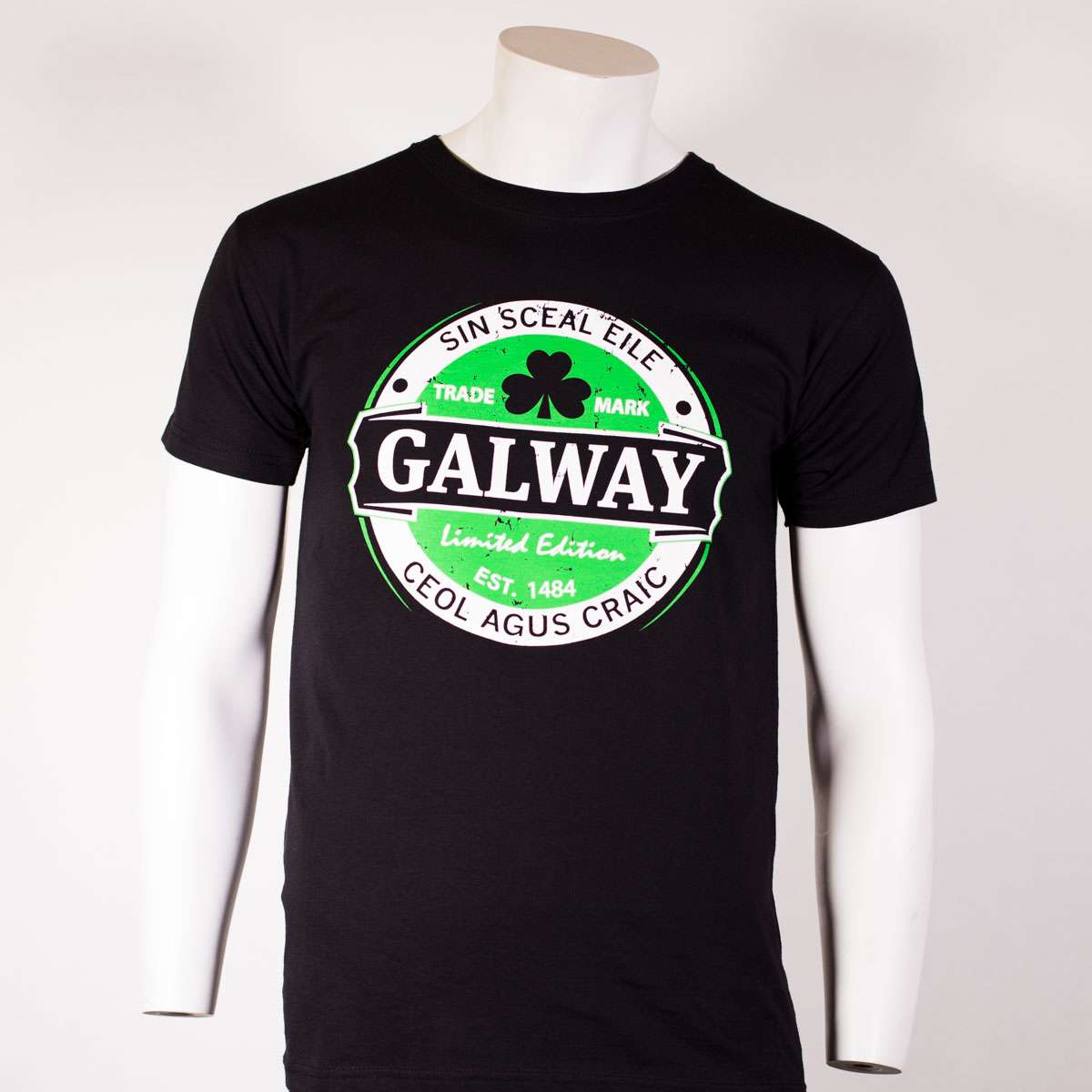 Introducing our Galway Beer Mat Logo Shirt, a unique and playful addition to your wardrobe. This black T-Shirt features Galway Text in a beer mat style, along with the text "Sin Sceal Eile" (That's another story) and "Ceol Agus Craic" (Music & Fun). It's available for shipping on ZhivagoGifts.ie and in-store at Zhivago Gifts in Galway.