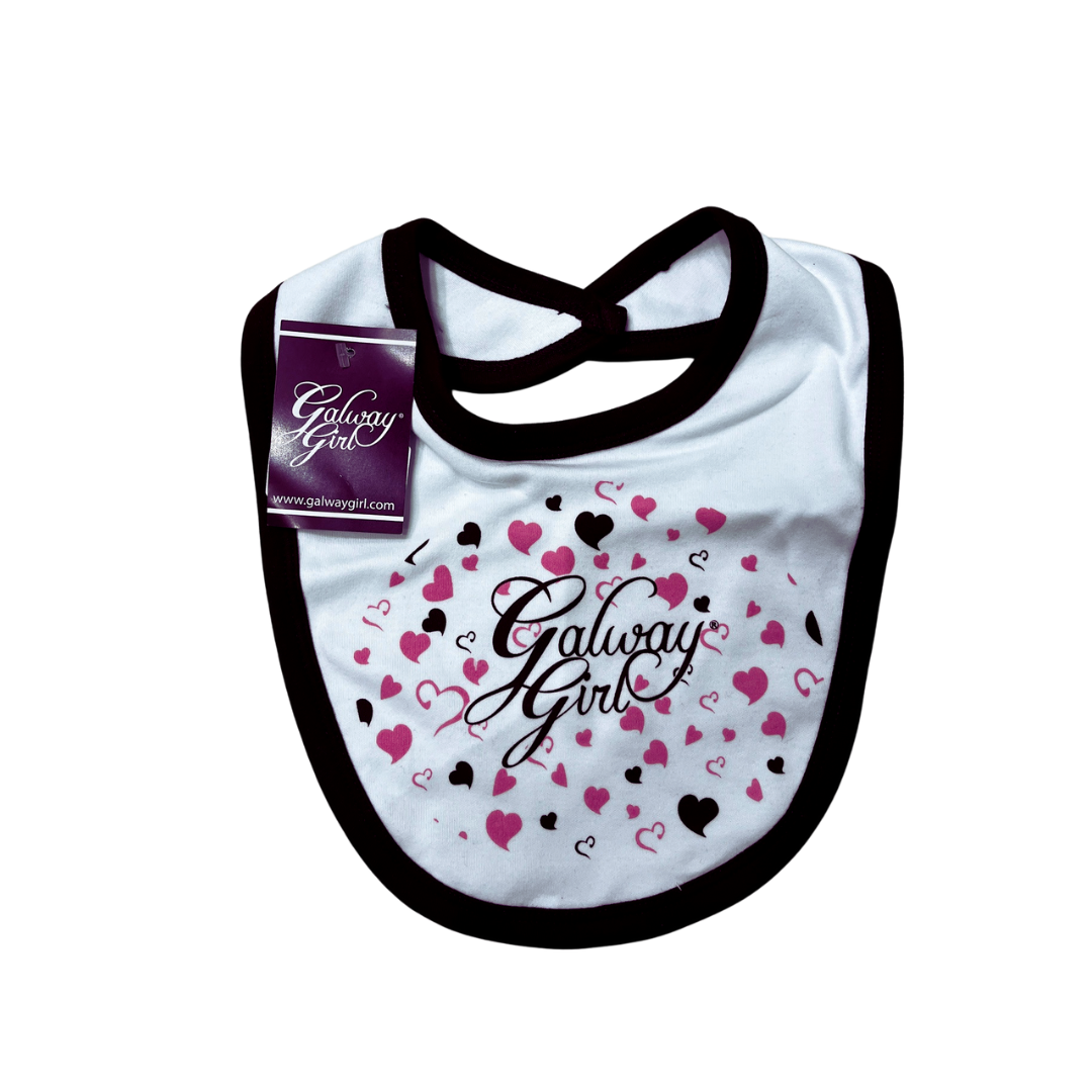 Introducing the Galway Girl Babies Bib, a charming accessory for your little bundle of joy. This cute bib features the iconic Galway Girl logo in maroon against a pristine white background adorned with a hearts motif. Designed with both style and functionality in mind, it's the perfect addition to your baby's wardrobe. Plus, for a limited time, you can get this adorable bib for just €5!