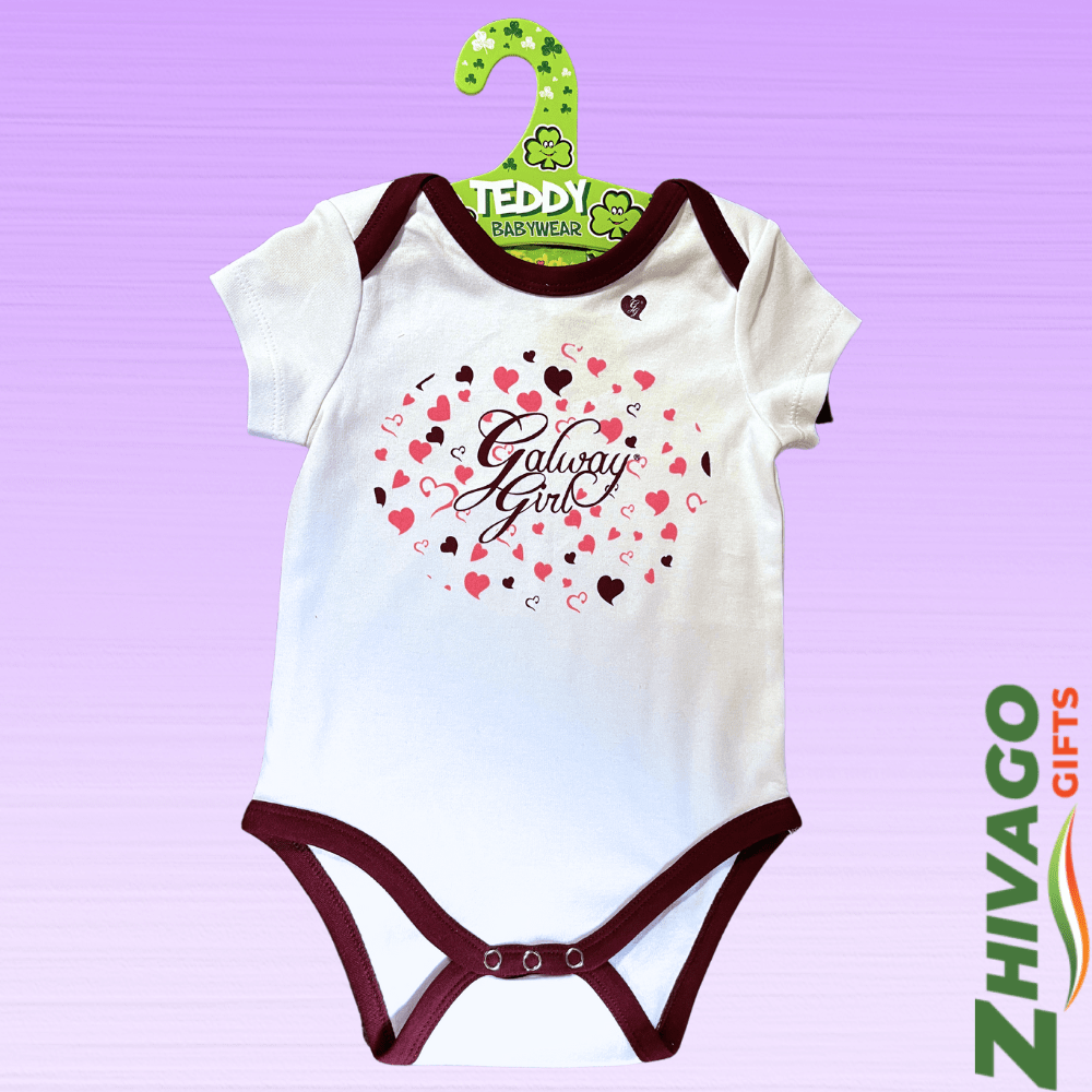 Introducing our Galway Girl Babygrow, the perfect outfit for your little ones! This adorable white babygrow features maroon piping, highlighting the official color of Galway. The iconic Galway Girl logo is placed on a bed of hearts, adding a charming touch to this cute ensemble.