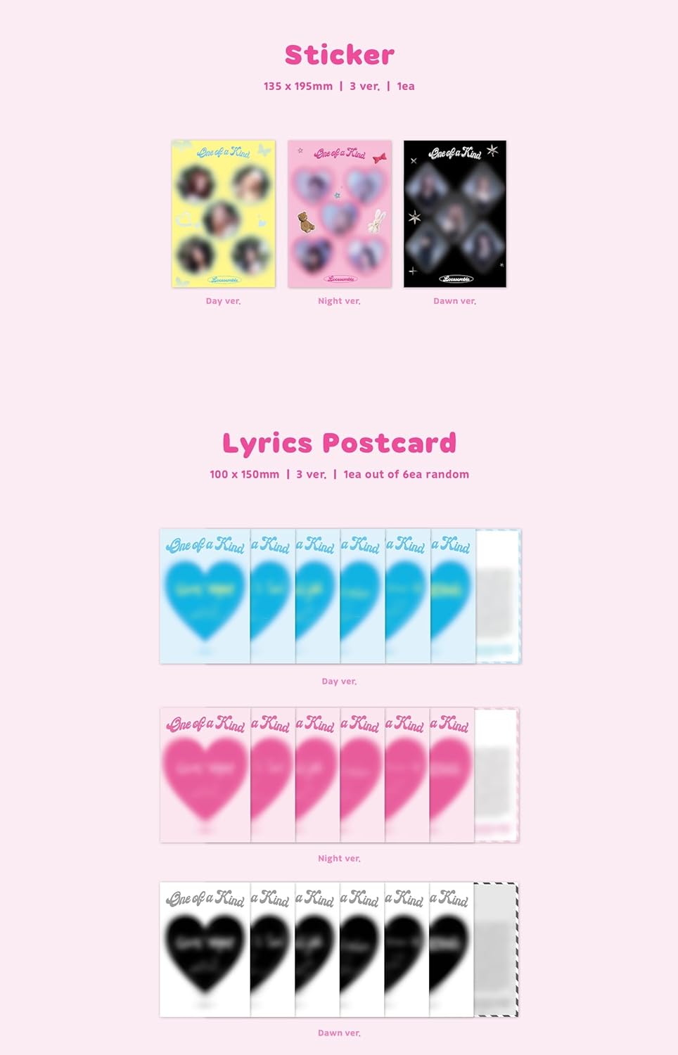 Random cover (Day / Night / Dawn) Includes 64 page photobook + postcard + photocard stand + sticker + photocard