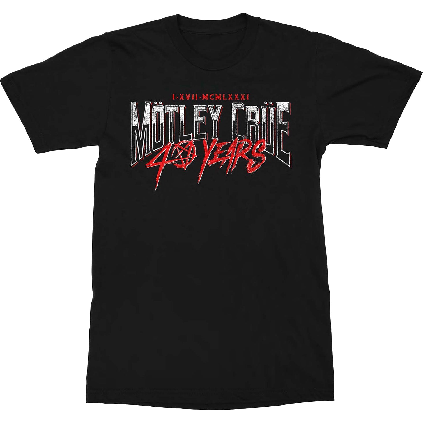 Upgrade your music merchandise collection with this officially licensed Motley Crue Tee, showcasing the commemorative '40 Years' design motif. Available online at IrelandVinyl.com and in-store at Zhivago Gifts in Galway, this high-quality black t-shirt is perfect for fans of the iconic rock band.