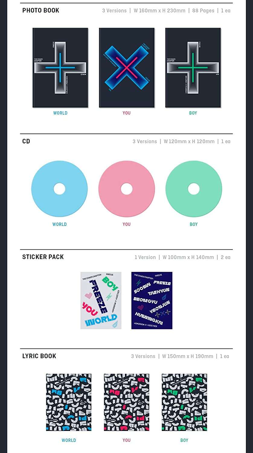 The album package includes three different cover types sent at random, an 88-page photobook, a photocard, postcard, and sticker set. Unveil the beautiful chaos with "The Chaos Chapter: Freeze", an album that's sure to be a treasure for any K-pop fan.