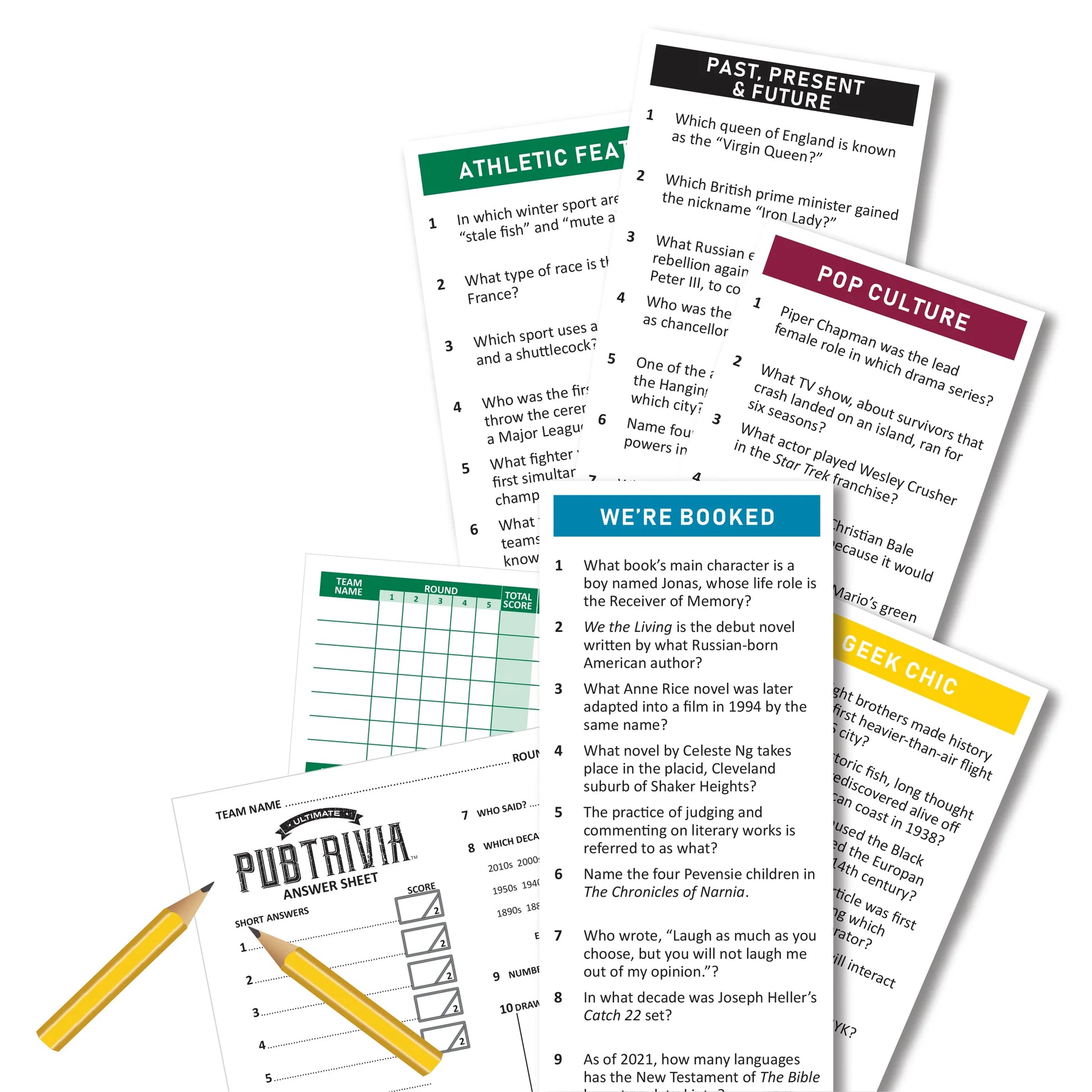 Bring the excitement of pub quiz night right into your home! Ultimate Pub Trivia lets you test your wits with 1,000 original questions across five thrilling categories: Sports, Past Present & Future, Pop Culture, Anything Goes, and Literature. Perfect for team play with family and friends—just like your favourite trivia night, but in your living room!